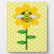 This awesome plaque features a graphic image of a cute yellow bumblebee with black stripes, eyes, antennas and legs. It has pretty blue and white wings. The bee is sitting on the middle of a golden yellow sunflower. The flower has a green stalk and three leaves. The message "happy bee day" appears spread over the three leaves. The background is composed of a yellow honeycomb pattern.