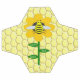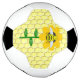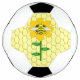 This awesome soccer ball features a graphic image of a cute yellow bumblebee with black stripes, eyes, antennae and legs. It has pretty blue and white wings. The bee is sitting on the middle of a golden yellow sunflower. The flower has a green stalk and three leaves. The message "happy bee day" appears spread over the three leaves. The background is composed of a yellow honeycomb pattern.