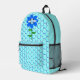 This awesome backpack features a graphic image of a cute blue bumblebee with bright blue stripes, black eyes, blue antennae and black legs. It has pretty blue and white wings. The bee is sitting on the middle of a pretty blue sunflower. The flower has a green stalk and three leaves. The message "Bee Day boy" appears spread over the three leaves. The background is composed of a pale blue honeycomb pattern.
