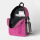 This awesome backpack features a graphic image of a cute pink bumblebee with bright pink stripes, black eyes, pink antennae and black legs. It has pretty blue and white wings. The bee is sitting on the middle of a pretty pink sunflower. The flower has a green stalk and three leaves. The message "Bee Day Girl" appears spread over the three leaves. The background is composed of a bright pink honeycomb pattern.