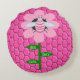 This awesome round pillow features a graphic image of a cute pink bumblebee with bright pink stripes, black eyes, pink antennae and black legs. It has pretty blue and white wings. The bee is sitting on the middle of a pretty pink sunflower. The flower has a green stalk and three leaves. The message "Bee Day Girl" appears spread over the three leaves. The background is composed of a bright pink honeycomb pattern.