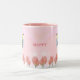 Happy bees and pink tulips Mug. Happy text can be personalised.