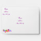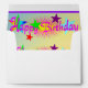 This is an invitation envelope that matches the invitation and RSVP card "Happy Birthday and Stars". This birthday sign or banner is designed with "Happy Birthday" in a rose colour. Stars in purple, red, blue and multi colours, and a bright yellow sun with rays are used as a backdrop. On the back is the banner with a rainbow coloured backround added along with a purple border. This envelope can be customised with all your own information.