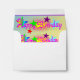 This is an invitation envelope that matches the invitation and RSVP card "Happy Birthday and Stars". This birthday sign or banner is designed with "Happy Birthday" in a rose colour. Stars in purple, red, blue and multi colours, and a bright yellow sun with rays are used as a backdrop. On the back is the banner with a rainbow coloured backround added along with a purple border. This envelope can be customised with all your own information.