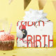 Contemporary Happy Birthday text on white with party balloons and gold confetti.