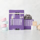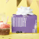 White Happy Birthday text on purple background with black balloons, sparklers, and candle.