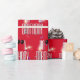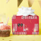 White Happy Birthday text on red background with black balloons, confetti, sparklers, and candle.