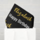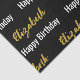 The tissue paper is black. It has a text pattern for the recipient's name and Happy Birthday. The name (Shown: Elizabeth) appears in an elegant faux (not foil) gold script. The other text is white. All of the text can be edited.