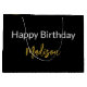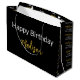 The happy birthday gift bag is black. The recipient's name in a faux gold script and the phrase Happy Birthday is above the name. The name (Shown: Madison) appears in an elegant faux (not foil) gold script. The other text is white. All of the text can be edited.