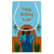 Happy Birthday! This design features a curvy African American beauty with a blue jacket and dress on a terra cotta colored wall with plants and blue background.