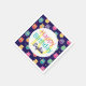 Girls Happy Birthday Blue Owl Pattern Personalised with Name and Age Party Paper Napkins. Dark midnight blue background with multi-coloured owls and hearts design. Teal, blue, green, pink, purple, orange, yellow, and red owls in a fun pattern. Centre white circle shows age in light yellow in centre. Happy is written in pink, Birthday in teal with name personalised in dark midnight blue. Fun personalised animal themed party supplies for kids, tweens and teens. Adorable colourful rainbow owls pattern.
