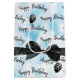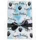 Happy birthday text with a black sheer bow and black and white polka dot balloons on aqua bokeh background.