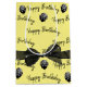Happy birthday text with a black sheer bow and black and white polka dot balloons on yellow background.