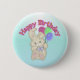 Happy Birthday Bunny Button, share this adorable bunny button with a friend or family member on their birthday. This very colourful bunny is light brown , has a smiling face carrying balloons, says Happy Birthday in mauve, yellow and pink highlight , set on a turquoise background.