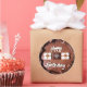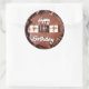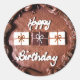 The top of a chocolate cake with three present decorations and the words "Happy Birthday"