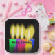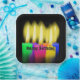 Close up of colourful glowing birthday candles on black background with Happy Birthday text.