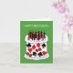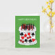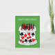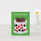 A white birthday card which is decorated on top with red and black candles and images of playing card suits around the sides. The words' Happy Birthday' accompany the image which has a green colored background.