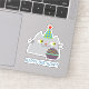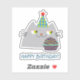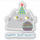 Cute, cartoon grey cat with party hat and cake funny Happy Birthday sticker.