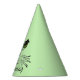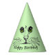 This personalised party hat is light green with an illustration of a cat face with a cute nose and long whiskers and big bright green eyes. Customise the Happy Birthday text with the template.