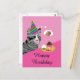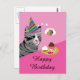 Birthday cat in colourful party hat sitting in front of some cupcakes but thinking about a tasty rodent. Put on the party hats, bring out the cake (or the rodent?) and celebrate!