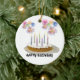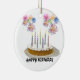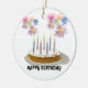 This ornament is decorated with a birthday cake, fireworks and the text, "Happy Birthday"