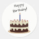 A Happy Birthday round sticker with a chocolate and vanilla cake.