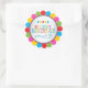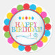 Circle with coloured circles around it in red, blue,green, yellow, and pink. "Happy Birthday" in the centre