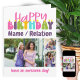 Personalised Happy Birthday photo card lettered with colourful candles. The template is ready for you to add 3 of your favourite photos and personalise the wording with a name or relation (Isabella / bestie / sister, for example), a message at the bottom such as "have an awesome day!". You can also customise the message inside if you wish.