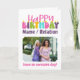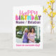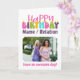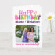 Personalised Happy Birthday photo card lettered with colourful candles. The template is ready for you to add 3 of your favourite photos and personalise the wording with a name or relation (Isabella / bestie / sister, for example), a message at the bottom such as "have an awesome day!". You can also customise the message inside if you wish.