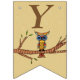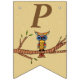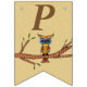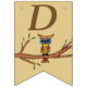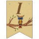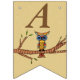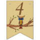 This flag shaped bunting Happy Birthday banner is light brown with an abstract colourful owl with big round eyes sitting on a brown tree branch with leaves.  Customise the birthday year with the templates.