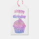 Happy Birthday text in pink and lavender with a pastel pink and lavender cupcake. Text for who it's to and from is on the back.