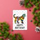 This greeting card features a cute and colourful tiger and rainbow polka dot pattern with "Happy Birthday" embellished in your choice of silver or gold foil.
