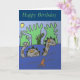 This lovely childrens birthday card, shows a simple cartoon of a spotty dinosaur, in a blue lake with bright green plants against a light blue sky. It is bright and colorful, with text that can be altered by you to make it personal.