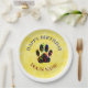 A puppy paw print covered with confetti and streams. Yellow watercolor background.