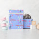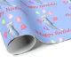Blue birthday gift wrap with my design of a leaping dolphin surrounded by balloons, wearing a party hat. Text says "Happy Birthday"