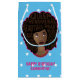 This design features "Queen, phenomenal, beautiful, smart, magic, boss, loving, sexy, independent, funny, creative, and strong" nested in her afro, with colourful layered necklaces with pink border on a starry, turquoise background.