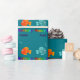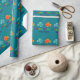 Wrapping paper ideal for a birthday gift. Blue paper with a picture of two cute cartoon fish. A blue fish on the left and an orange fish on the right. Both are face to face blowing bubbles into a heart shape. Below the fish are words in multi coloured text reading "Happy Birthday". Under that is a space to add a name using the template to replace the example text.