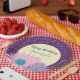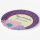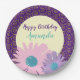 Pretty pink and purple flowers with yellow spiral Happy Birthday paper plate.