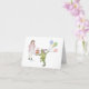 The frog has a strawberry layer cake and balloons. He sports a jaunty birthday hat as he presents the cake to a little girl in a pink polka dotted dress.