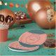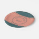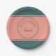 This paper plate design features a centred geometric double circle in teal over a pale salmon background. Personalise the text fields or click customise to select a typeface colour, size, and style your prefer.