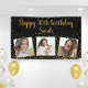Celebrate a big birthday with this banner featuring 3 photos of the birthday girl/boy and the birthday girl's name, all set against a black background accented with faux gold glitter confetti sparkles. Fun and festive perfect for any birthday celebration.