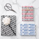 This wrapping has three different patterns but the message is the same, Happy Birthday. The first sheet is black and white. The second design is a red and black mirror image and the third design is blue text on a white background.