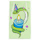 Happy green snake drawing in blue and pink party hat wrapped around blue candle and surrounded by falling pink and blue confetti.
