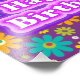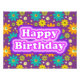 Happy Birthday in white lettering outlined in shades of pink and purple. The background is purple with lots of colourful hippie flowers. The main background purple colour can be changes by clicking customise and selecting the background colour of your choice.