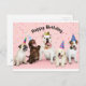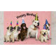 A joyful scene of five playful dogs wearing colourful party hats, surrounded by confetti.