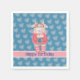 This adorable design is great for a child's birthday. It features a female bull in a pink sweater, holding a hot chocolate, with peppermint sticks. The background is blue with a light blue heart pattern. The text can be customised.