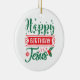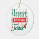 Happy Birthday Jesus ceramic Christmas ornament in festive red and green holiday colors with a sprig of holly and snowflake accents.