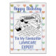 Turf laying cartoon. Lawn care expert is laying grass in a customer's garden. Personalize with your own details and message. Card for a turf layer. Turfing birthday card.
