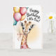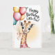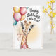 This adorable birthday card features a charming baby giraffe with large, expressive eyes and a sweet smile, set against a soft pastel background. The giraffe is illustrated in warm tones of orange, cream, and brown, and appears to be holding a bundle of colourful balloons—pink, red, yellow, teal, and purple—tied together with a pink ribbon bow.