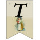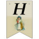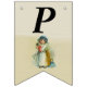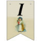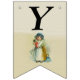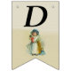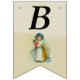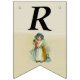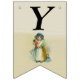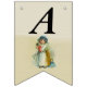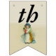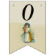 This flag shaped bunting banner has a little Victorian girl with chubby cheeks and curls wearing a hat holding her doll with a doll house and more dolls at her feet on a tan and cream coloured background. Customise the Happy 40th Birthday text with the templates.
